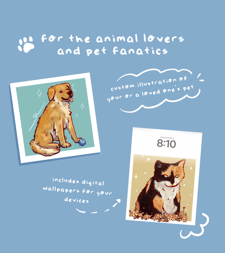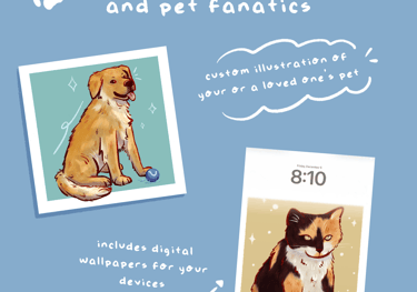 Base price for a custom illustration starts at $45. Additional costs are charged for requests including the level of detail (ex: full illustration with background instead solid color background), number of pets, and format of the illustration. A full quote will be provided after a request has been submitted.